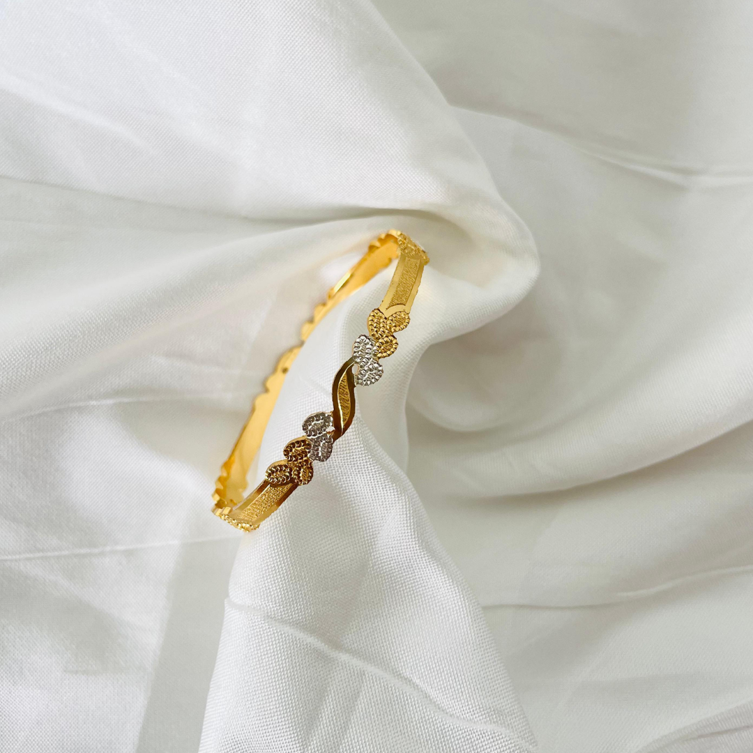 The Poornima Gold Plated White Gold Bangle is a graceful piece designed to add timeless beauty to your jewelry collection. With its dual-tone finish of radiant gold and subtle white gold, this bangle reflects sophistication and versatility, making it perfect for both daily wear and special occasions.