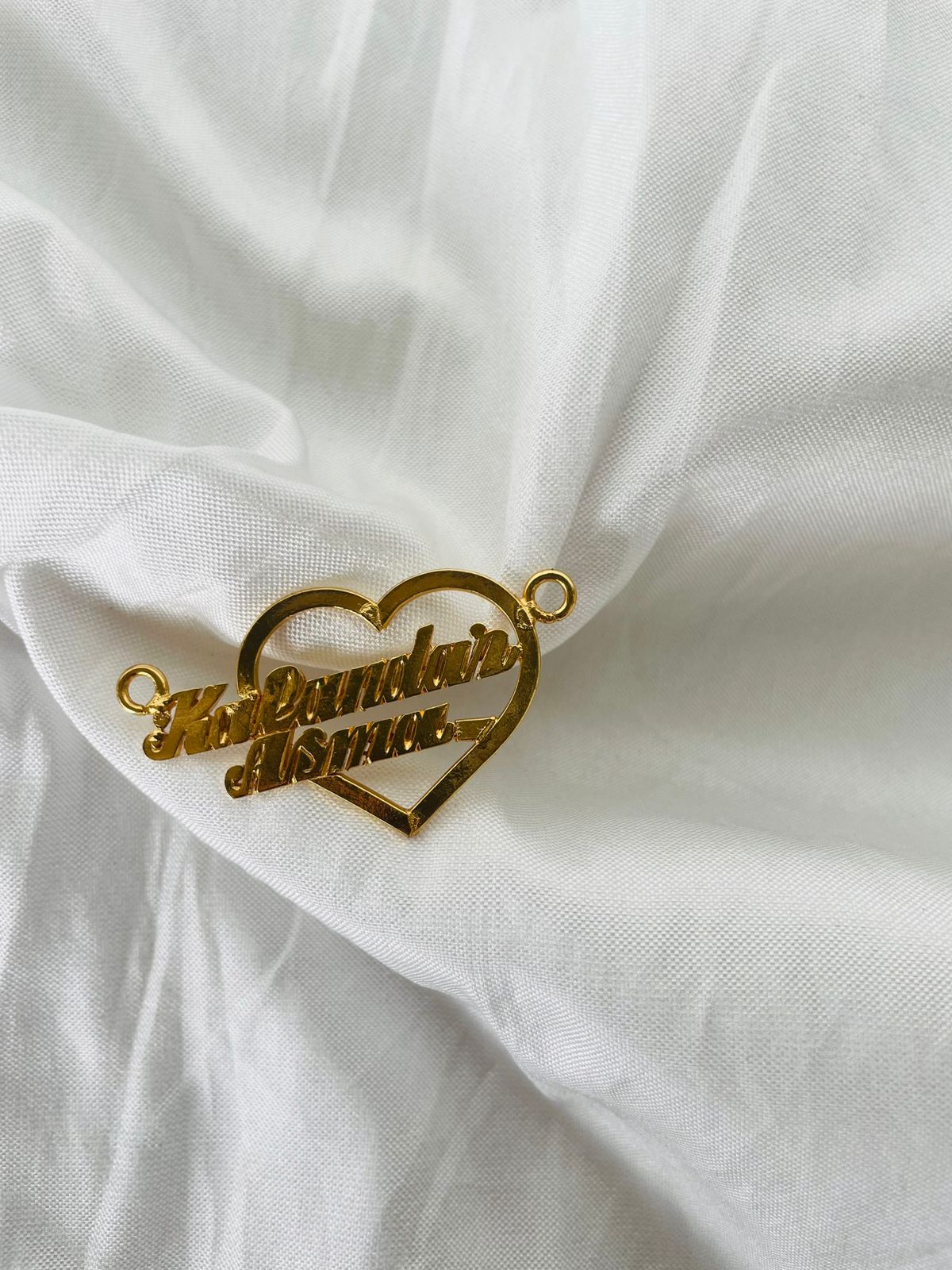 A timeless piece of jewellery designed just for you. This stunning pendant is crafted with a luxurious 24ct gold plated finish, featuring a circular frame adorned with delicate heart accents. At its centre, your chosen name is beautifully inscribed in elegant Arabic or English calligraphy, making it a truly personal keepsake.