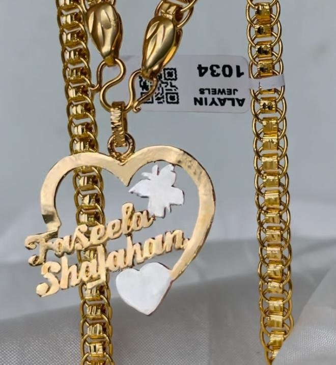 A timeless piece of jewellery designed just for you. This stunning pendant is crafted with a luxurious 24ct gold plated finish, featuring a circular frame adorned with delicate heart accents. At its centre, your chosen name is beautifully inscribed in elegant Arabic or English calligraphy, making it a truly personal keepsake.