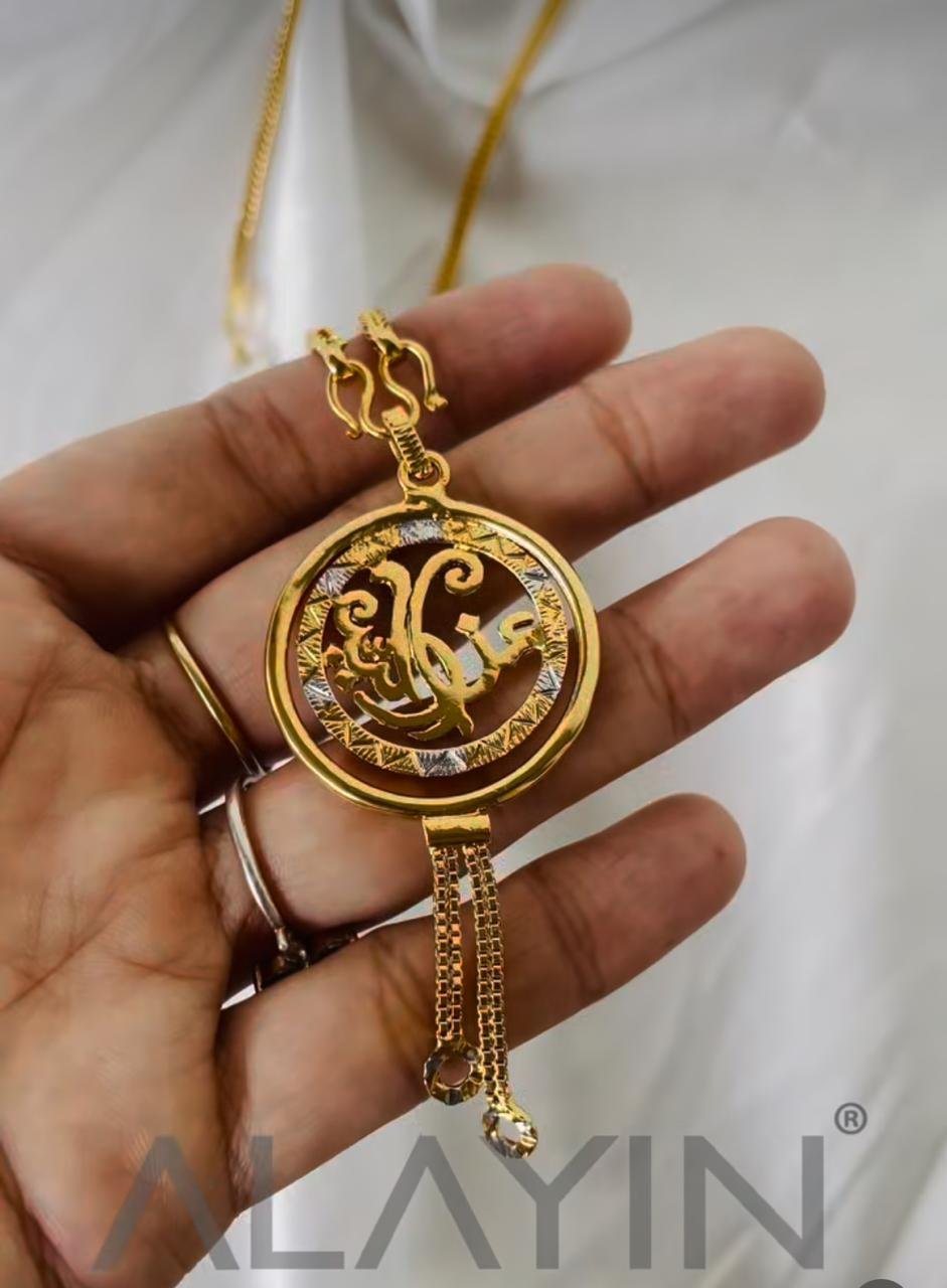 A timeless piece of jewellery designed just for you. This stunning pendant is crafted with a luxurious 24ct gold plated finish, featuring a circular frame adorned with delicate heart accents. At its centre, your chosen name is beautifully inscribed in elegant Arabic or English calligraphy, making it a truly personal keepsake.