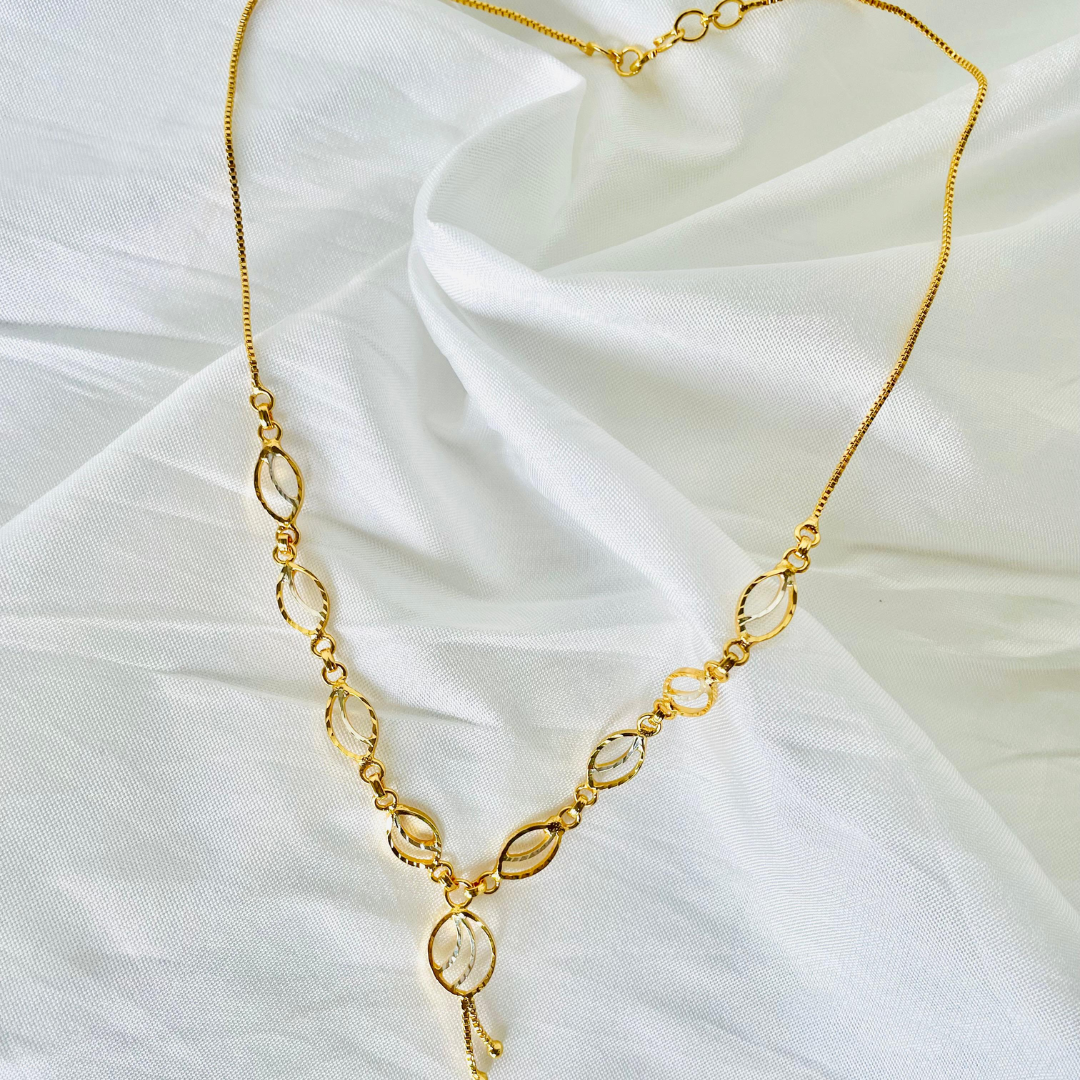 The Safaron 24ct Gold Plated Necklace is a stunning accessory crafted to bring out the elegance in every woman. With its classic 18-inch design, this necklace rests gracefully on the neckline, making it perfect for both everyday wear and special occasions.