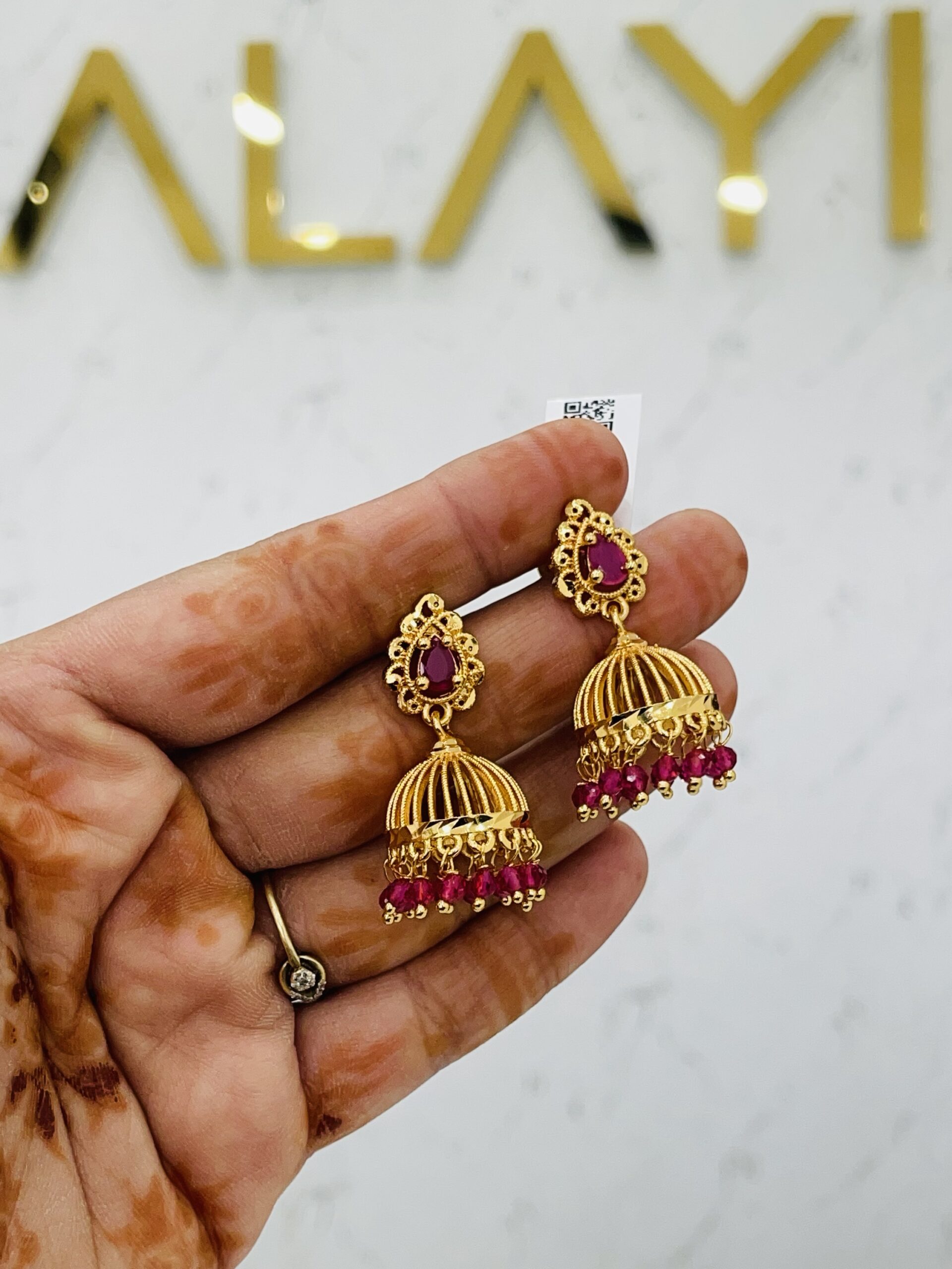 Elegant 24 ct gold-plated jumka earrings featuring a trendy dome design with rich ruby-toned stones and delicate bead detailing. Lightweight, long-lasting, and perfect for festive and everyday wear.