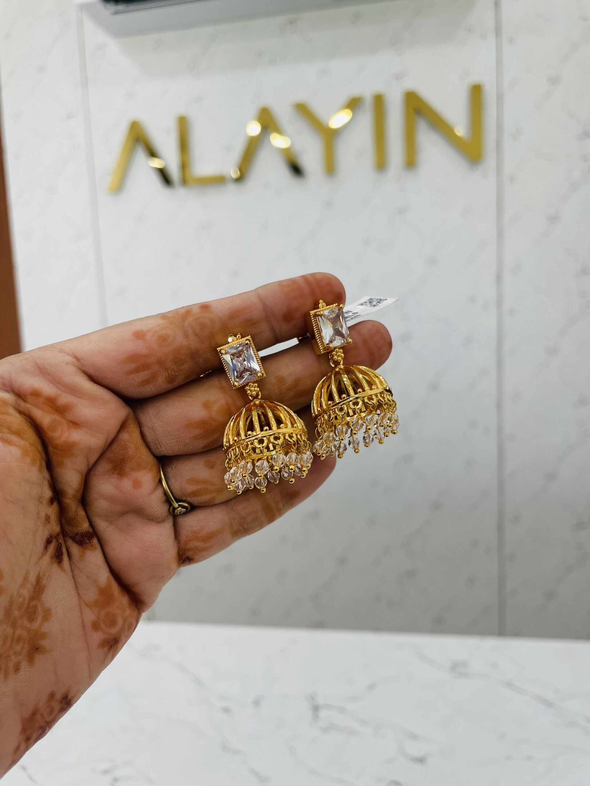 The beautifully crafted dome-shaped jumka is detailed with fine gold-tone work and adorned with shimmering white crystal bead danglers that enhance its charm and movement. The combination of classic jhumka style with a modern, minimal color palette makes it perfect for both traditional and contemporary looks.