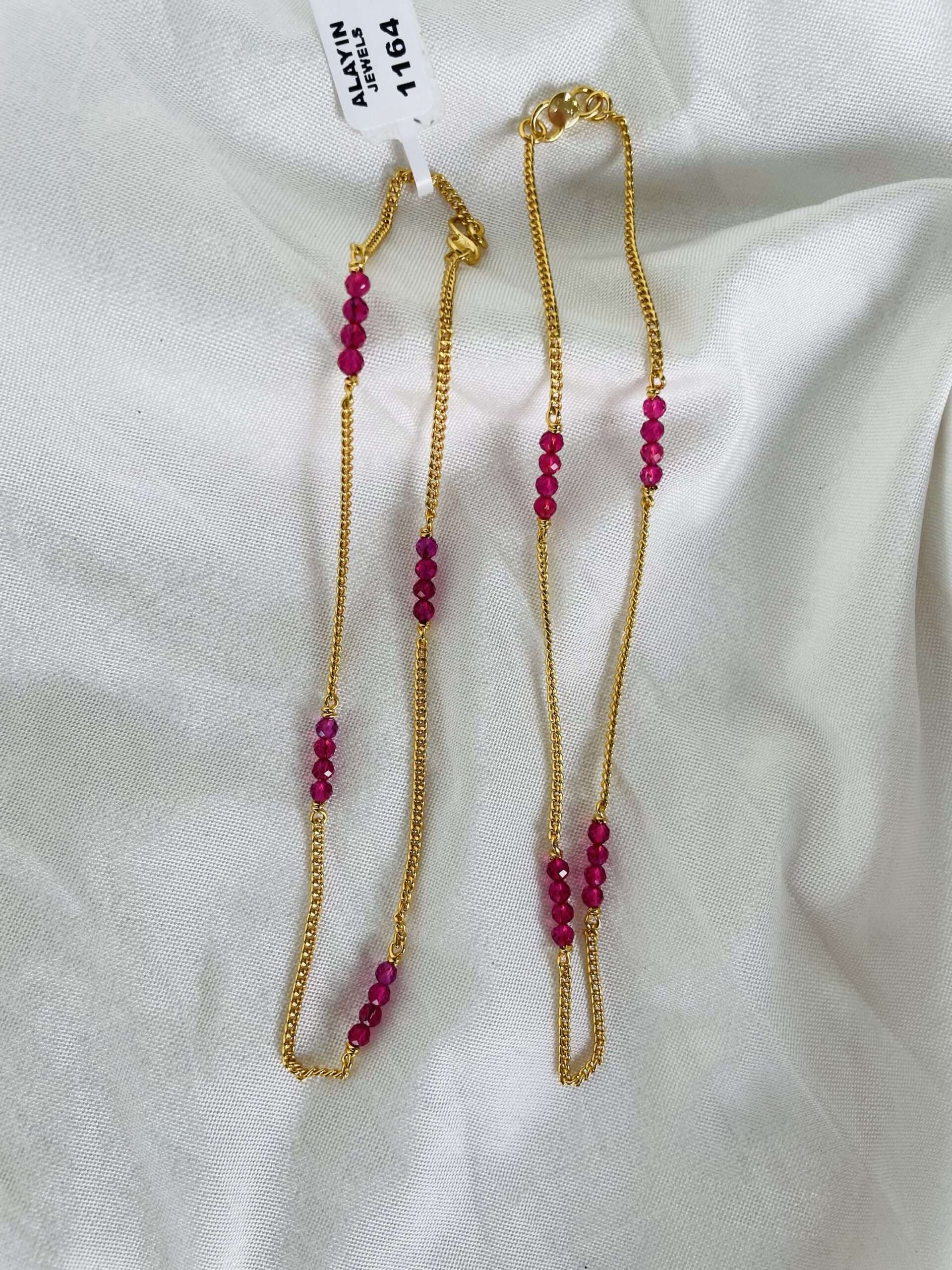 Elegant gold-plated chain anklets with ruby-red beads – a perfect blend of tradition and style.
