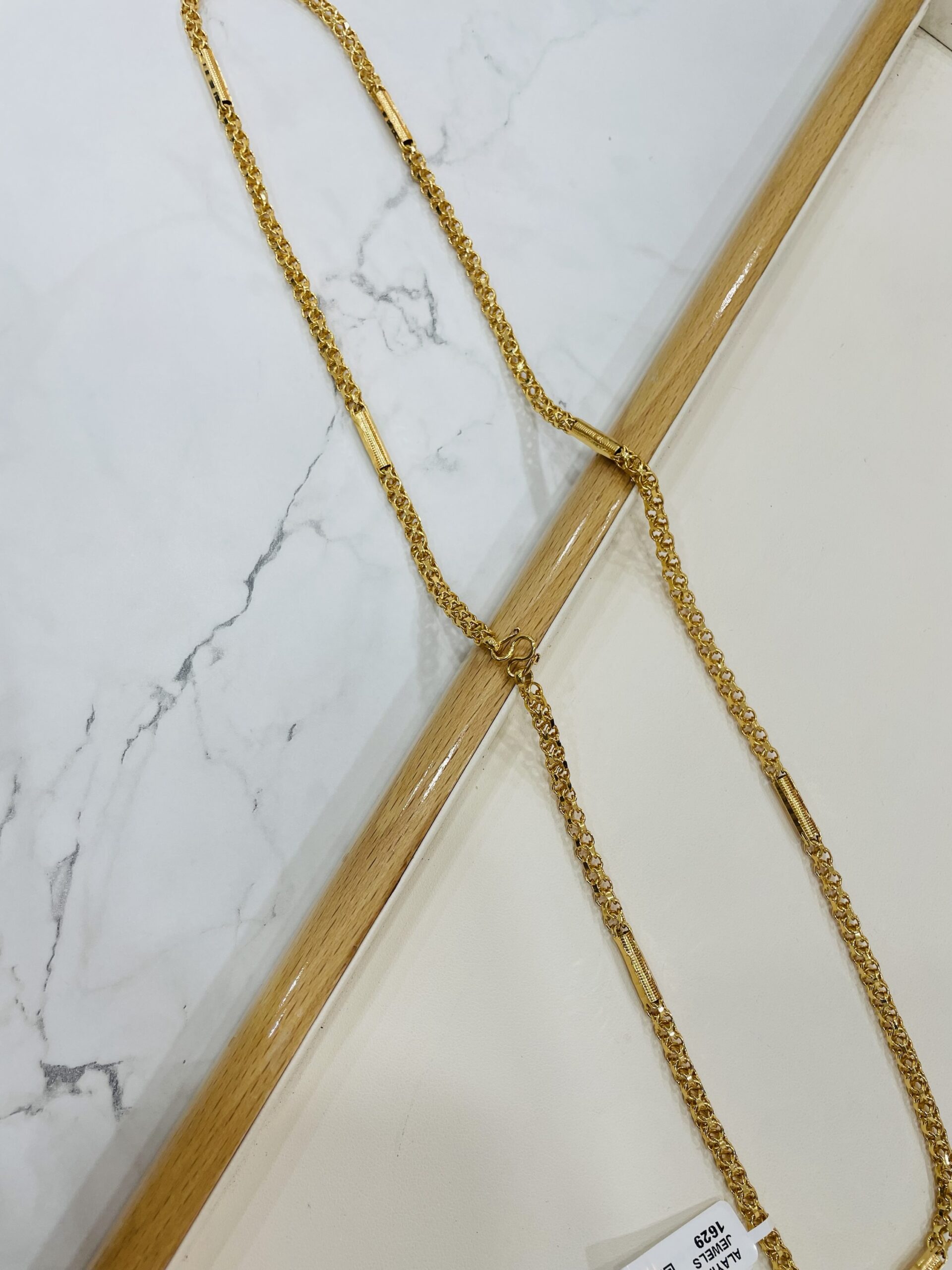 This elegant gold chain showcases a distinctive link pattern enhanced with sleek bar accents that add a modern and refined touch to the design. The polished gold finish highlights its luxurious shine, making it a standout accessory for any occasion. Carefully crafted for durability and comfort, the chain sits smoothly around the neck while maintaining its bold and stylish appearance. Its versatile design makes it suitable for both casual outfits and formal attire, allowing it to be worn alone for a classy statement or layered with other pieces for a contemporary look. A timeless addition to any jewelry collection and an excellent gift choice for someone who appreciates fine craftsmanship and sophisticated style. ✨
